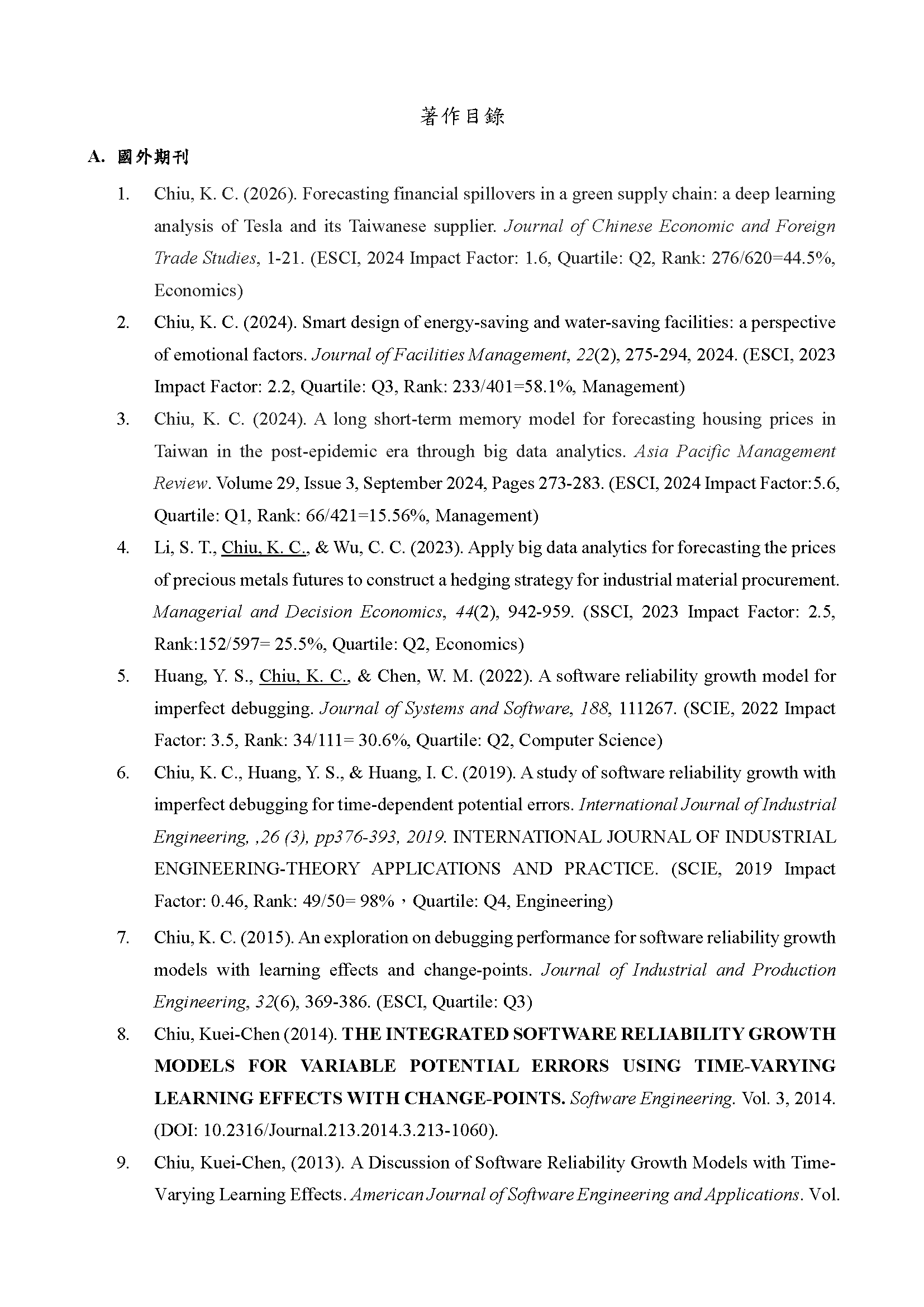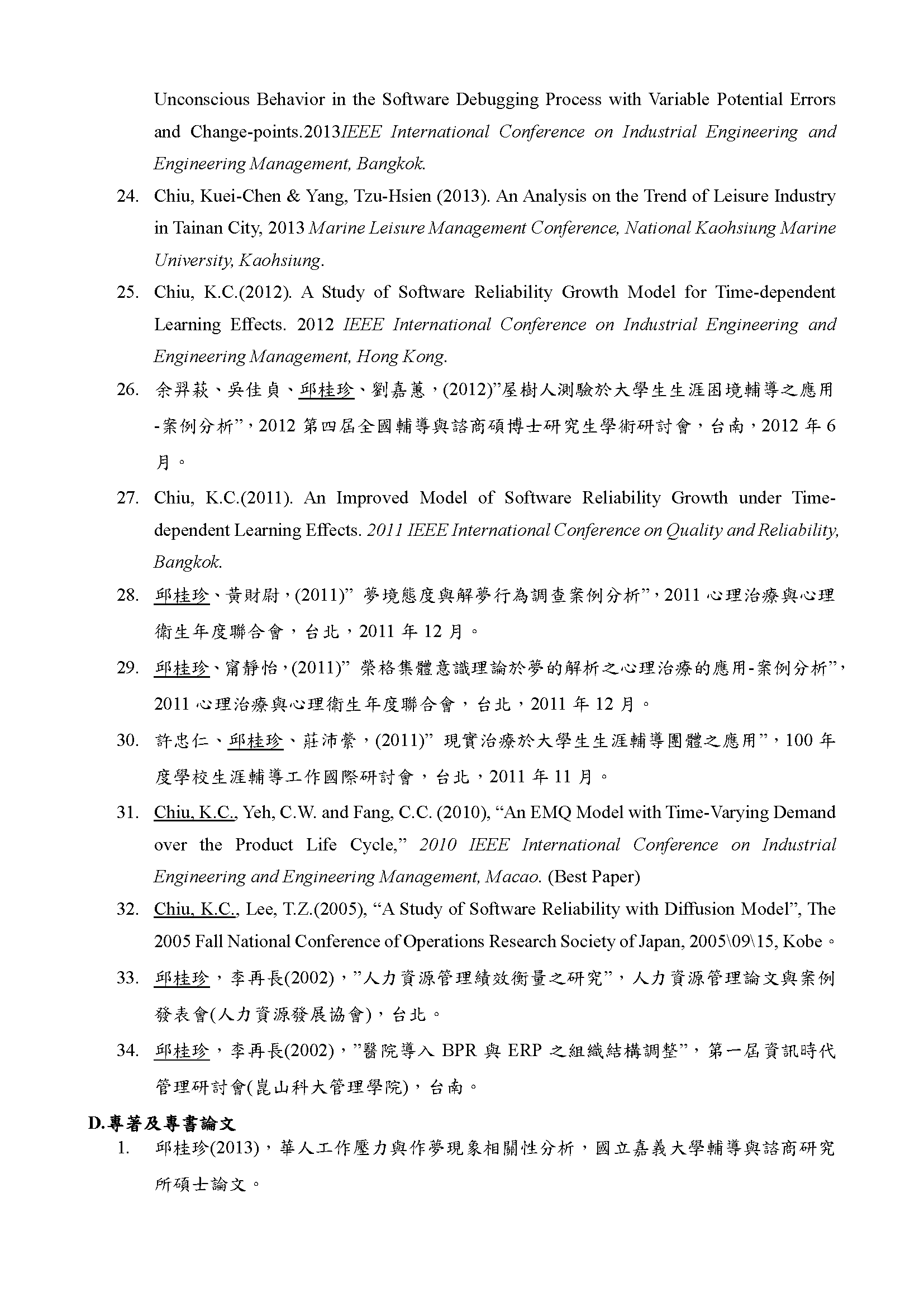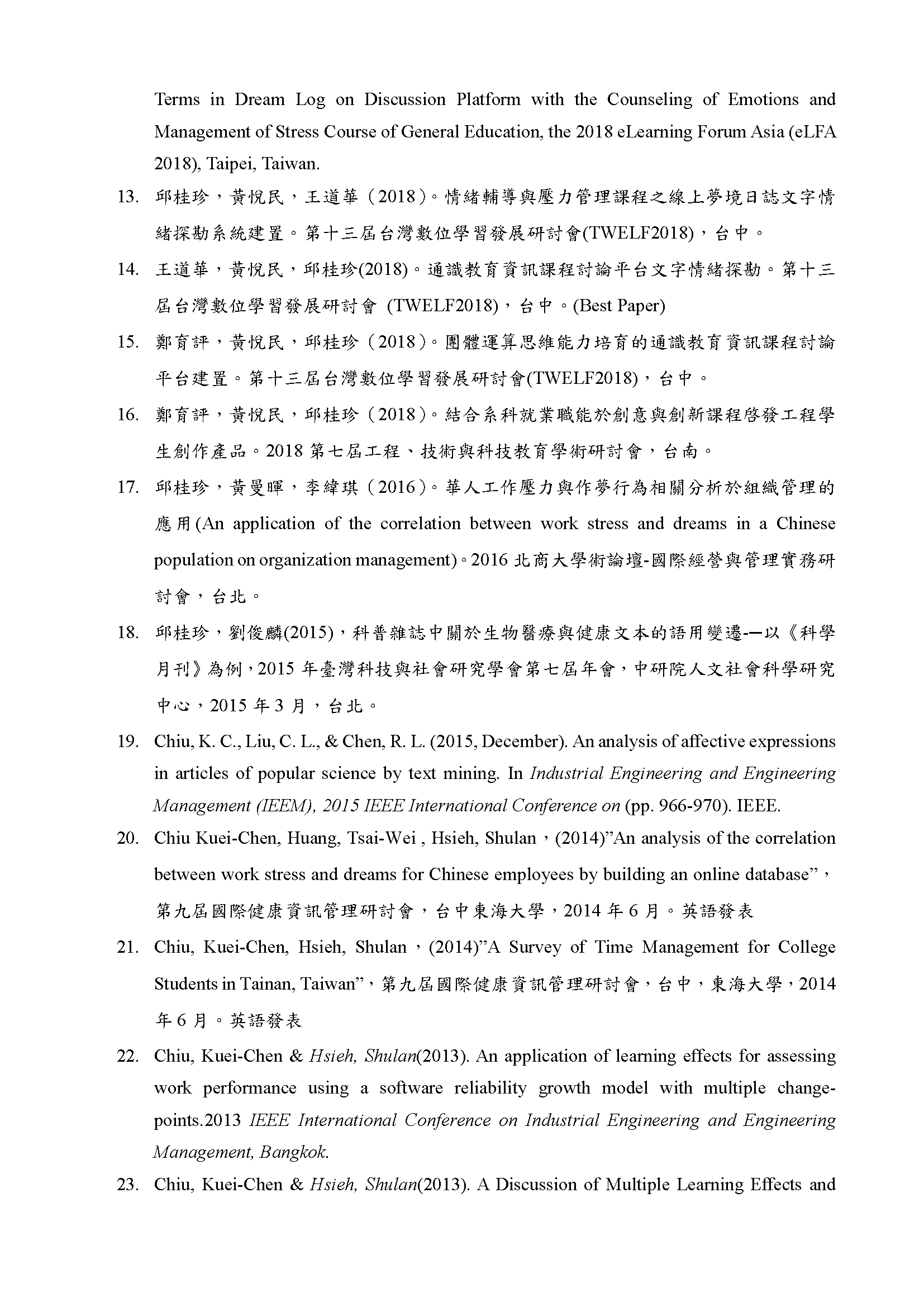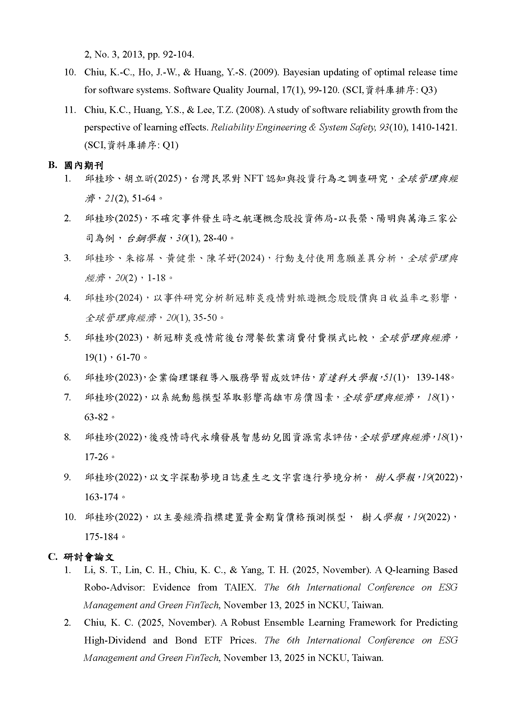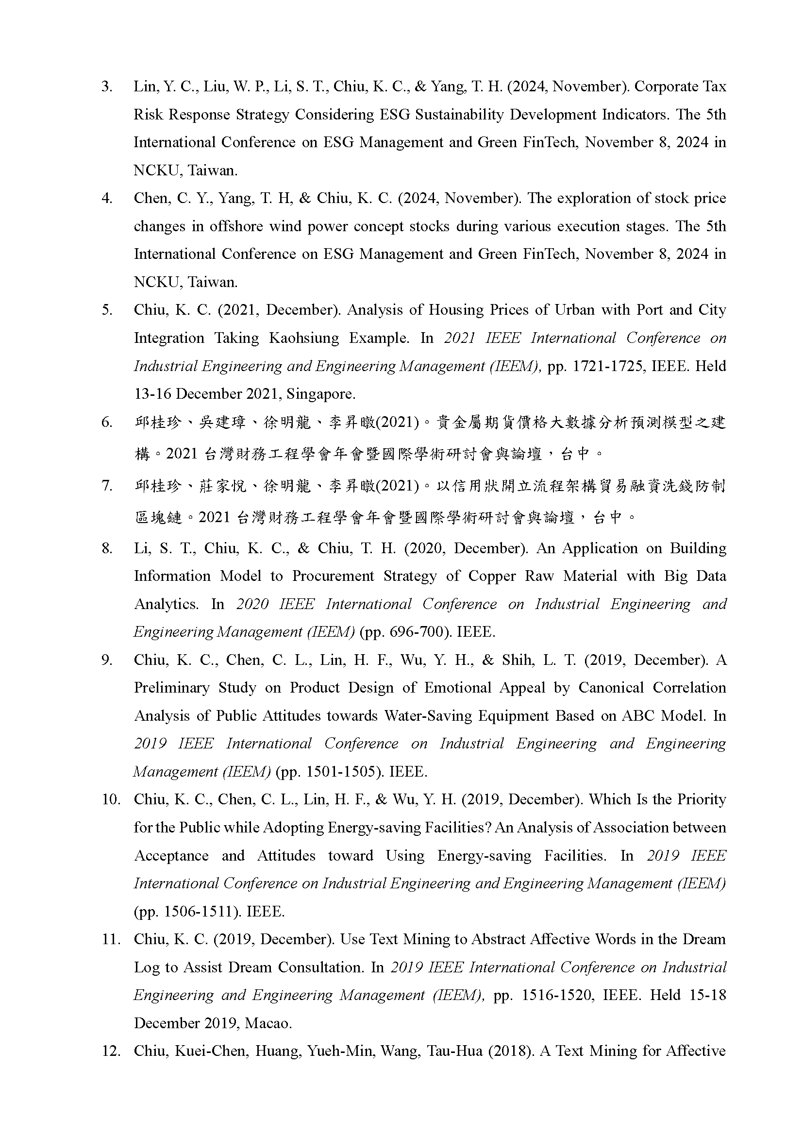 經歷:國立成功大學博士後研究台北科技大學附屬桃園農工代理輔導老師和春技術學院工管系專任助理教授兼教務處課務組組長國立台灣師範大學科學教育研究所博士後研究國立成功大學醫學院公共衞生研究所博士後研究國立中正大學哲學研究所博士後研究國立成功大學醫學院健康照護科學研究所博士後研究興國管理學院企管系專任助理教授兼教務處教資組組長興國管理學院企管系專任講師親民工商專校工管科專任講師兼學務處學宿組組長國立台灣師範大學心理輔導諮商研究所研究助理兼學輔中心行政台灣經濟研究院資訊服務處兼經濟部ITIS計畫助理研究員教學領域專長:金融科技、大數據、程式設計進階、資料科學、資訊管理、作業管理、品質管理、人力資源管理、管理學、管理心理學證照:理財規劃人員專業能力測驗(證照號碼:(114)金測理財電字第03125011115C0003號)衍生性金融商品證照(證照號碼:(113)金測衍生性商品電字第25124005415C0021號)金融科技力證照(證照號碼:(112)金測FINTECH電字第26123001015C0026號)企業電子化資料分析師:巨量資料處理與分析師證照(證照號碼:431210100003190)企業電子化規劃師(一級)(證照號碼:EPI-13249-0312)3DS MAX 2015AUTOCAD 2015